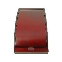 Unique two-piece set with ball pen and calculator. Ball pen features a soft, black grip in a silver barrel with chrome accents. Calculator is stationed on top of a rosewood finish base that matches with the box. Set items are placed within an arched wooden box in rosewood finish. Additional component engraving is available upon request. Please ask for details. Available in rosewood or cherry colors.